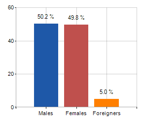 Territorial extension of Municipality of INDERØY and related population density, population per gender and number of households, average age and incidence of foreigners