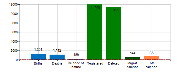 Resident population and its related trend, balance of nature and migratory balance, birth rate, death rate, growth rate and migration ratein