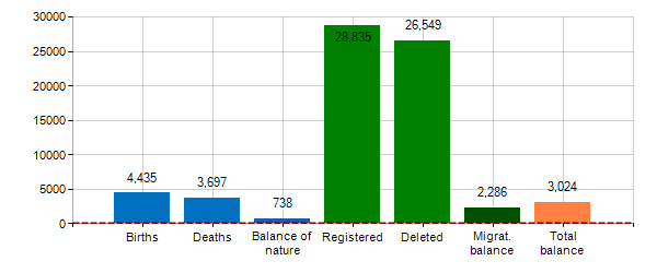 Resident population and its related trend, balance of nature and migratory balance, birth rate, death rate, growth rate and migration ratein