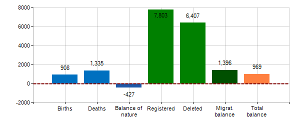 Resident population and its related trend, balance of nature and migratory balance, birth rate, death rate, growth rate and migration ratein