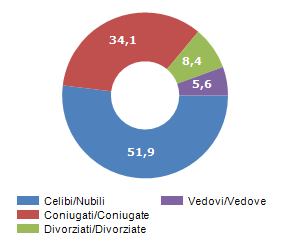 Famiglie residenti e relativo trend, numero di componenti medi della famiglia e relativo trend, stato civile: celibi/nubili, coniugati/e, divorziati/e, vedovi/e nel