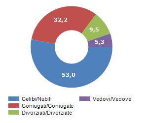 Famiglie residenti e relativo trend, numero di componenti medi della famiglia e relativo trend, stato civile: celibi/nubili, coniugati/e, divorziati/e, vedovi/e nella